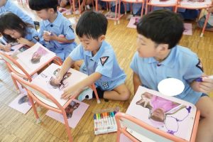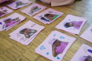 それぞれ自分の顔写真が貼ってあるカードの空いているところにまずはお絵描きタイム