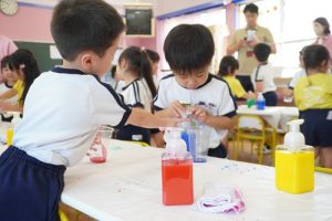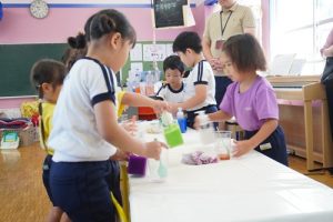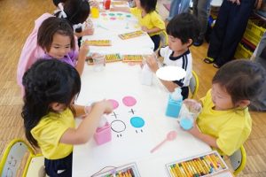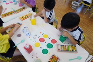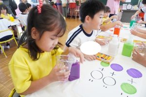 まずは、グループごとに分かれて「赤と青を混ぜるとどんな色になるかなと友だちと一緒に考えながら試行錯誤して取り組む姿が見られました
