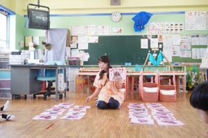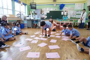 先生が、みんなのカードをバラバラに床に散らばせカードはどこにいったか分かりません。