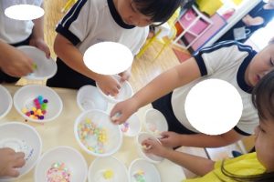 たんぽぽ組では、色水とビーズなどを使ってセンサリーボトル作りをしました