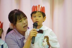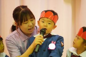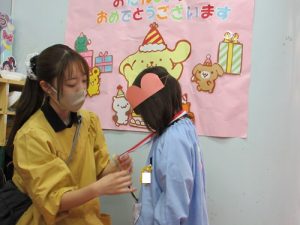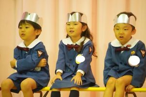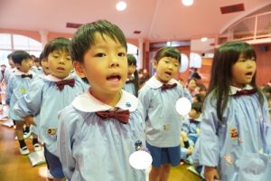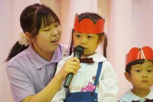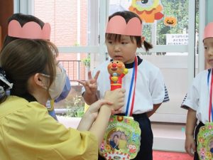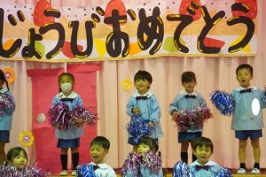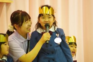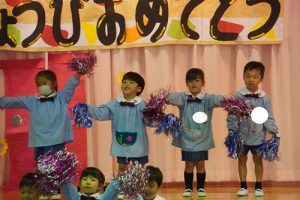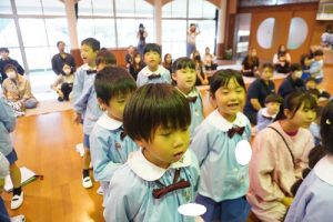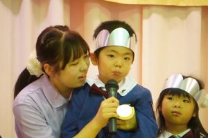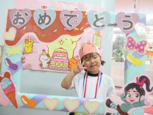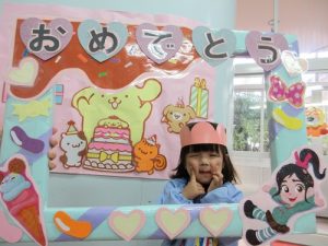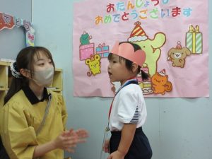 お誕生日会を盛り上げるために、お客さんのお友だちで「♪たんたん誕生日」とお誕生日のお友だちも一緒に「♪太陽の子幼稚園の歌」を歌いました