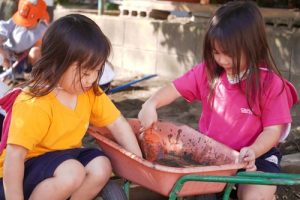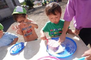 砂場をのぞいてみると、真剣に泥水をかき混ぜている年少さん。