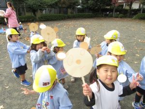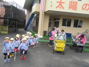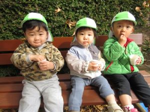 ちょうちょ組は<アンパンマンおせんべい>、みつばち組は<かっぱえびせん>を広い空や大きな木、お散歩中のワンちゃんを見ながら食べました![]()