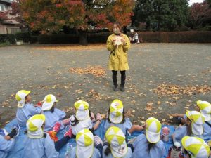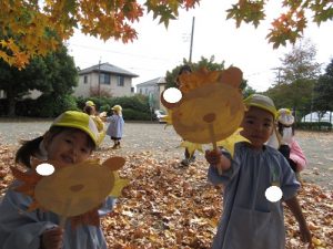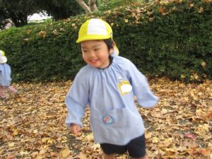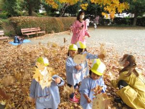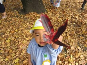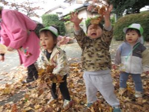 落ち葉の上を駆け巡ったり、好きな葉っぱを見つけたり、どんぐり探しをしたり、葉っぱを集めて空に向かってなげてみたり![]()