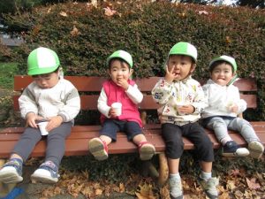 ちょうちょ組は<アンパンマンおせんべい>、みつばち組は<かっぱえびせん>を広い空や大きな木、お散歩中のワンちゃんを見ながら食べました![]()