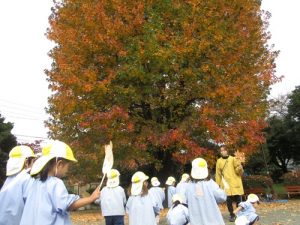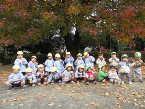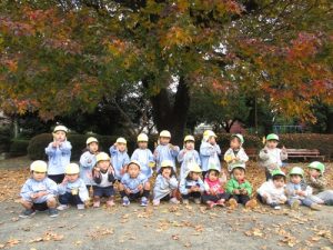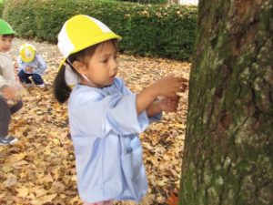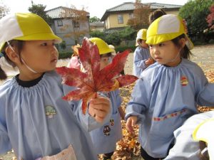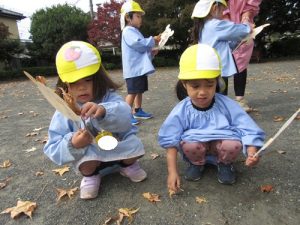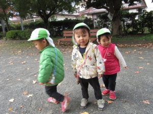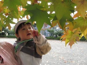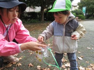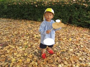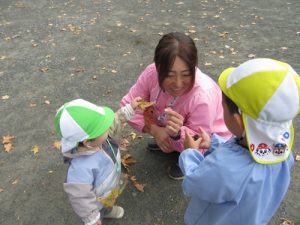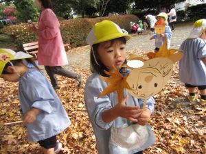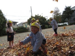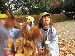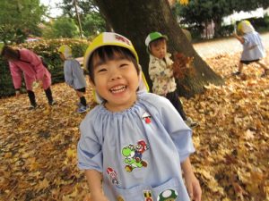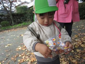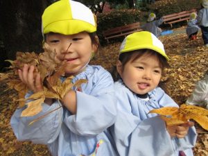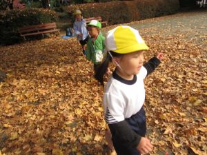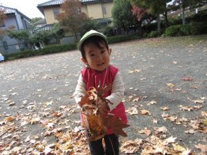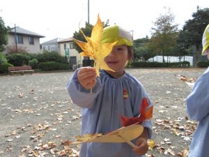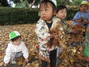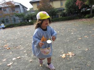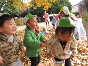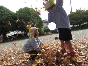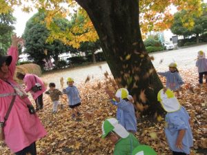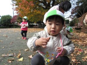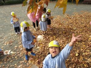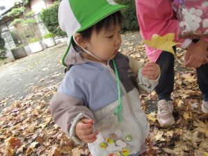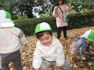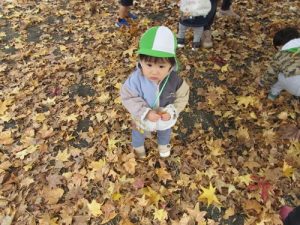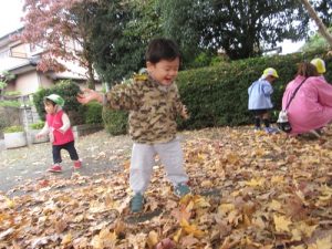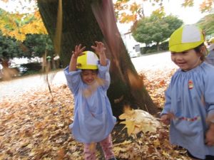 落ち葉の上を駆け巡ったり、好きな葉っぱを見つけたり、どんぐり探しをしたり、葉っぱを集めて空に向かってなげてみたり![]()