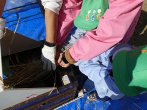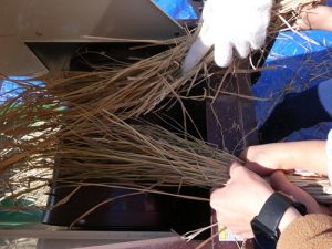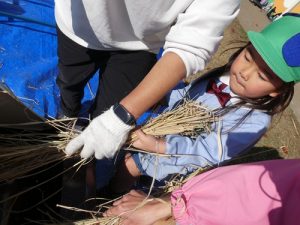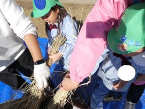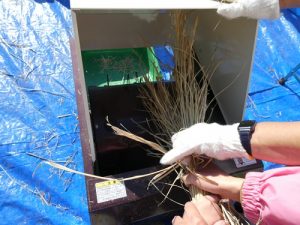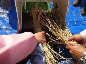 足ふみ型脱穀機を使って取り切れなかった部分はみんなで協力して手作業でおこないました