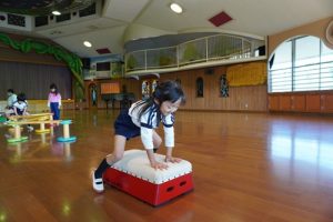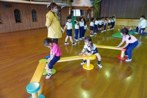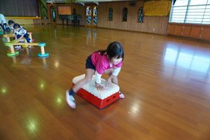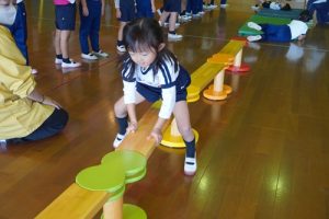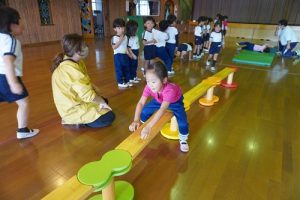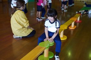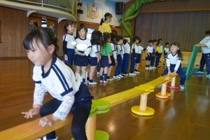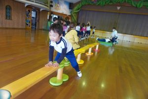 ゴロゴロ焼き芋になりきって転がった後は、平均台の上を「両手→お尻移動」の順序で移動します![]()