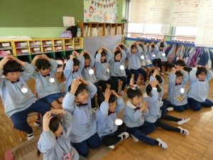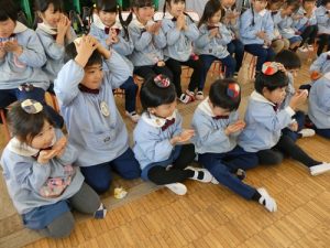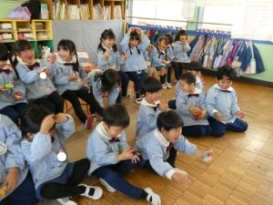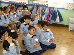 鏡餅に見立てて頭に乗せたり、乗せたままお願い事をしたりみんな上手にできましたね![]()