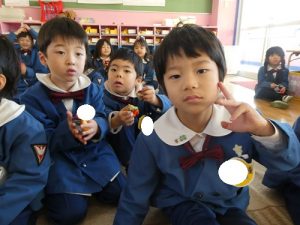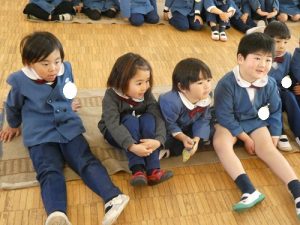 子どもたちは「ぺったん、ぺったん」の掛け声に合わせて友だちと一緒に、お手玉を餅に見立てて楽しそうに行うことができました!