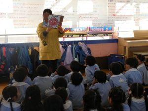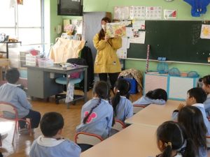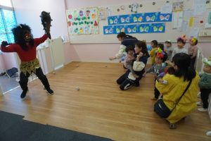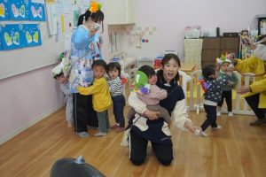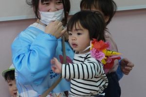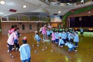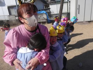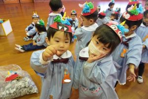 「おーにーだーぞー!」と年長さんが来てくれたので、豆まきごっこを楽しみました。
