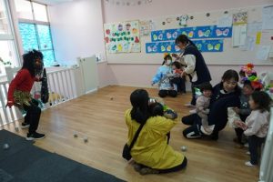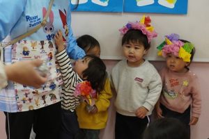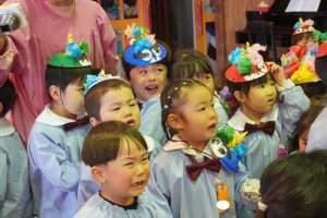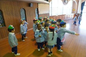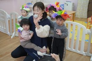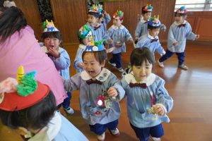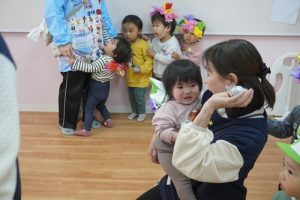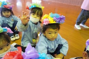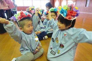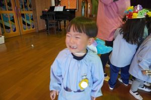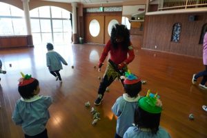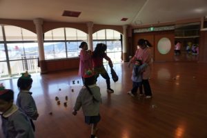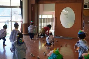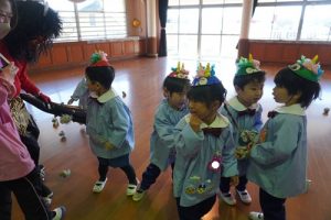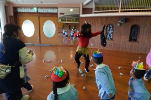 ホール組は、みんなで作った鬼のお面を披露会をしたり、楽しく豆まきごっこをする予定だったので、