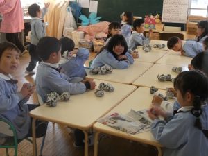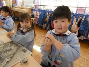紙芝居を読んでもらって、「節分」について改めて理解したり、豆まきごっこの為に自分たちで新聞紙でボール作りを行ったりしていました![]()