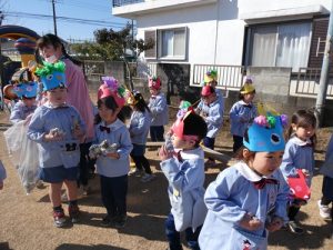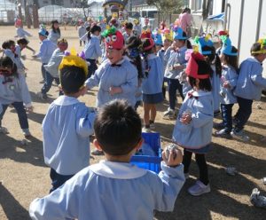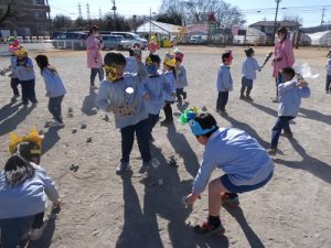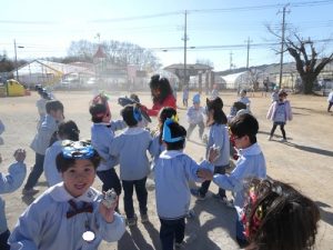 作ったお面を身に付けて、豆まきごっこをするため下の庭に集まりました![]()