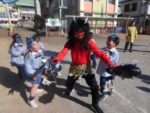 豆まきごっこを楽しんでいると赤鬼さんが現れて、色々な子どもたちの表情や果敢に戦う姿勢が見られました![]()