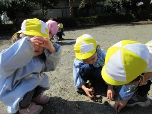 トゲトゲとした木の実を見つけると、「なにこれー!」と興味津々だった子どもたち。