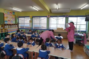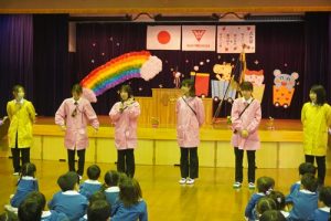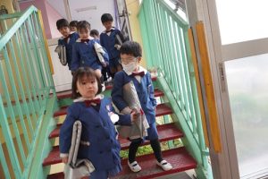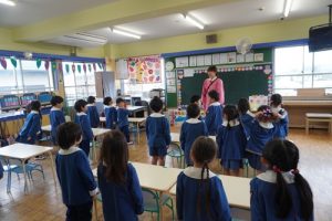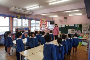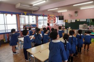 しばらく遊んだ後は、朝の会をして、ホールでの始業式に向かいました!