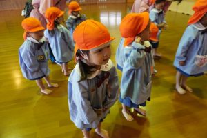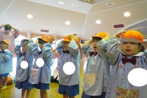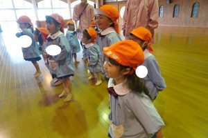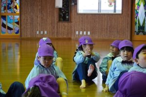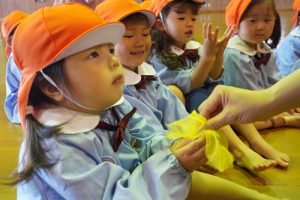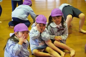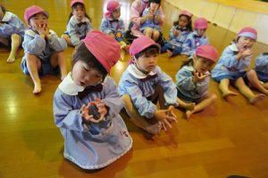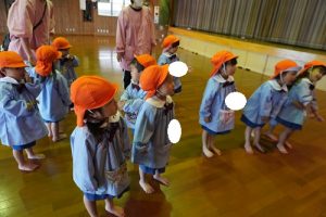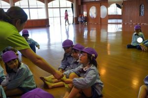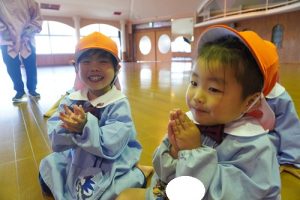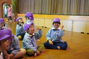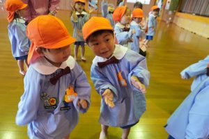 まず、最初に身体をほぐすために、手のひらを使ってほっぺや頭など色々な部位を触って手遊びをしました
