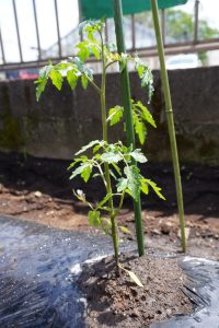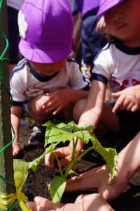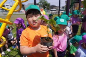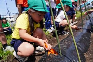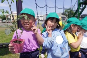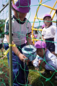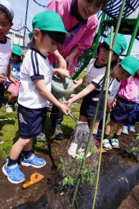 ゆり組はミニトマトの苗を、すみれ組はきゅうりの苗を植えました![]()