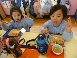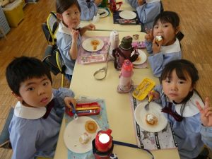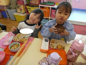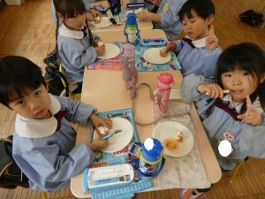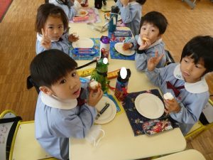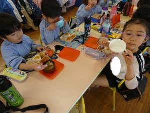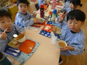 まずは、年中で植えた大根を使って作った味噌汁!子どもたちは前日から「早く食べたい!」と楽しみにしていました