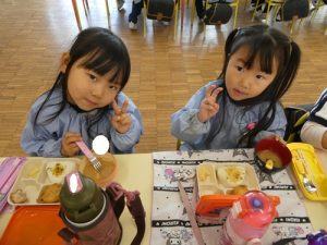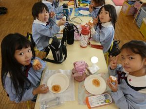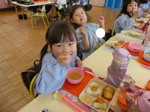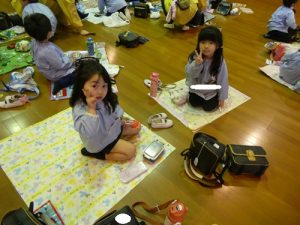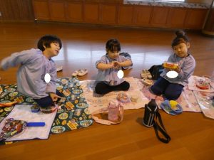 お店屋さんをした後に、ホールで輪になってお弁当を食べました