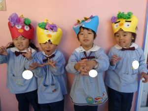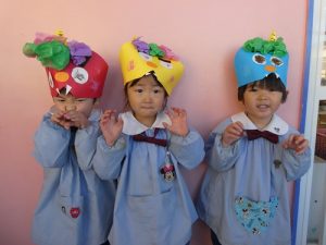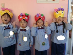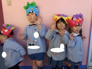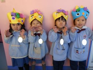 みんなで作った鬼のお面を被って豆まきごっこをしました!