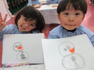 時には、みんなでアンパンマンを描いてみたり、雪だるまを描いてみたり‥‥![]()